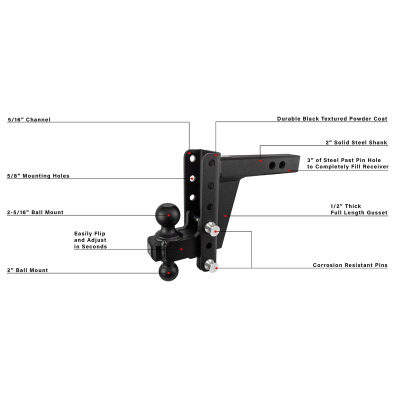 The BulletProof 2.0" Heavy Duty 6" Drop/Rise Hitch delivers unmatched strength and versatility, rated to tow up to 22,000 lbs with a 3,000 lb tongue weight. Whether you're hauling equipment, trailers, or heavy loads, this Class 4 hitch is engineered for serious performance.