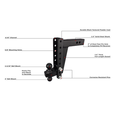 Our 2.5" Heavy Duty 10" Drop or Rise Hitch is unlike anything our competitors offer. We engineered one versatile hitch to handle the work of ten—saving you time, hassle, and cost.