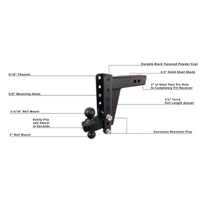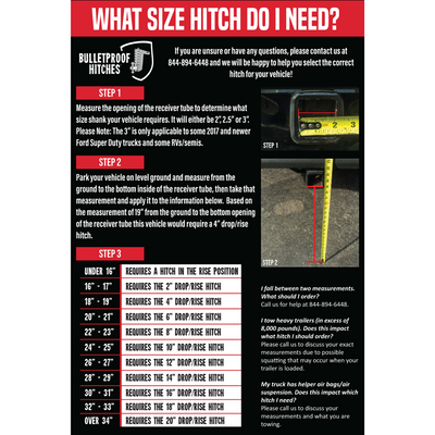 The BulletProof 2.5" Heavy Duty 8" Hitch is engineered for serious towing with a 22,000 lb capacity and 3,000 lb tongue weight. With 5 adjustable ride heights, it's perfect for lifted trucks or high receiver heights.