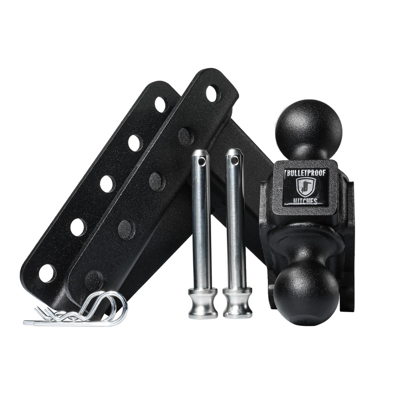 The BulletProof 2.5" Medium Duty 4" Drop/Rise Hitch delivers exceptional towing power with a 14,000 lb max towing capacity and 2,000 lb tongue weight, making it a reliable solution for most heavy-duty towing needs.