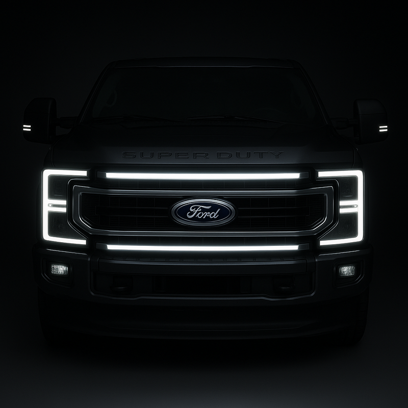 Custom LED grille light kit for 2021–2022 Ford Super Duty (F-250, F-350, F-450, F-550) with the NON high-flow grille—fits King Ranch, STX, XLT, and Platinum trims. The 6,500–7,000K white strip tucks neatly behind the factory grille, delivering a crisp DRL glow rated for 50,000 hours. The IP67-sealed housing is fully dust- and waterproof, built for year-round durability. Choose a stealth-black or classic-silver anodized frame to match your truck.