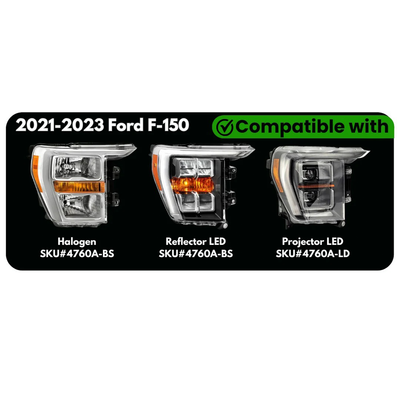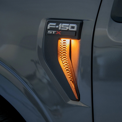 Upgrade your 2021-2023 F150 with a factory-fit amber LED fender vent kit that installs in minutes, no cutting, splicing, or drilling required. The only kit on the market with an integrated turn signal function.