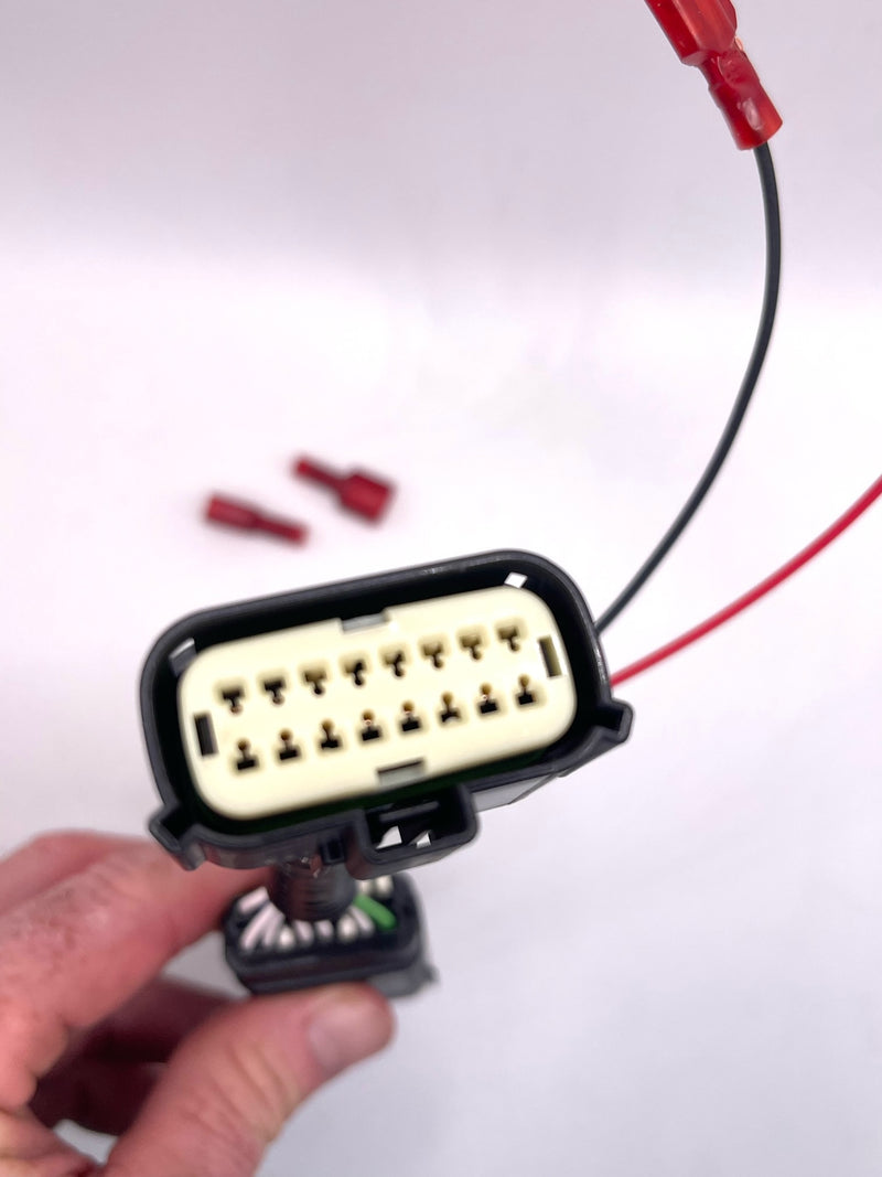 The plug-and-play harness connects between the headlight and the headlight harness on either side of the vehicle.